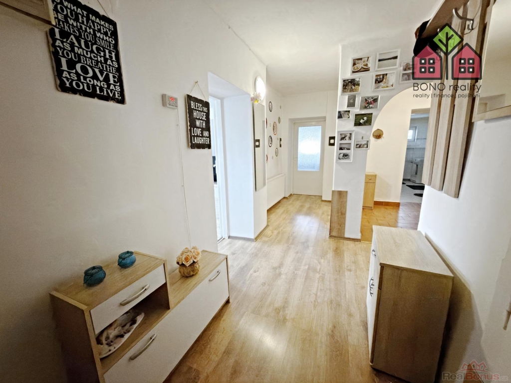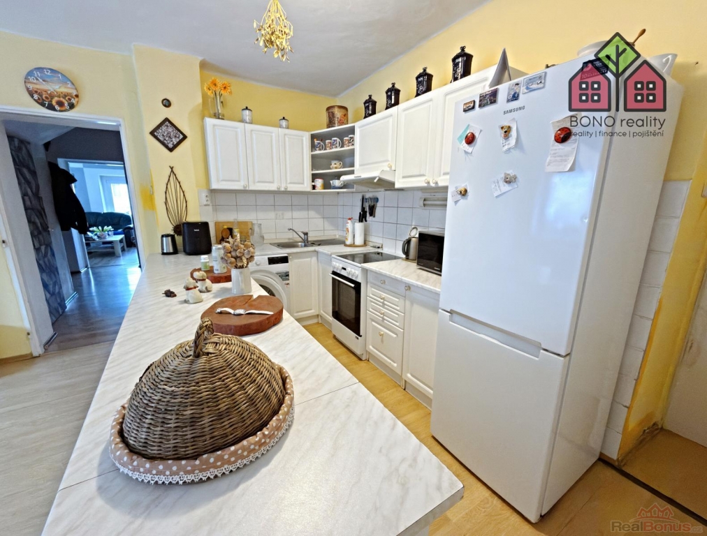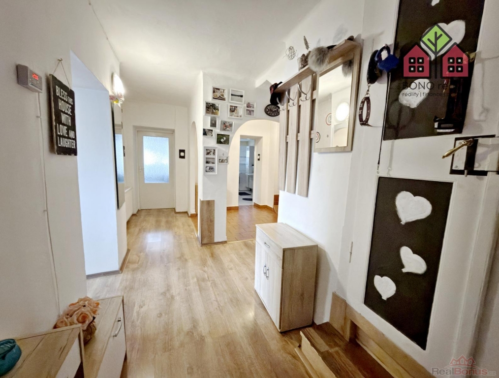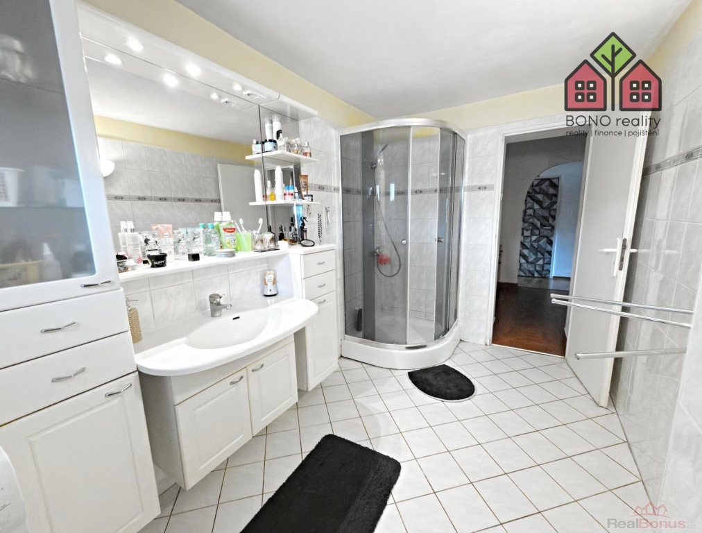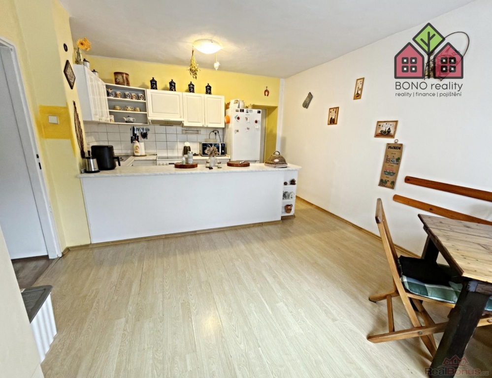 Pojďme si však nyní představit hlavní část rodinného domu o současné dispozici 5+1, kterou tvoří jedno nadzemní podlaží s obytným podkrovím. Již při vstupu do větší chodby na Vás dýchne velmi příjemná atmosféra útulného domova, neboť dům je po rekonstrukci, pečlivě udržován a stylově vybaven. Z chodby je vstup do kuchyně s jídelnou, obývacího pokoje, pokoje (nebyly pořízeny jeho fotografie z důvodu zachování soukromí vlastníka) a do koupelny s toaletou. V kuchyni je linka s velkým pracovním pultem (barový), elektrická kamna, přípojka pro automatickou pračku a místo pro lednici. U okna, s výhledem do zeleně, je pak umístěn jídelní stůl. Obývací pokoj má výměru 25,10 m2 a lze zde tedy umístit i opravdu velkou sedací soupravu, nezbytné skříňky či například počítačový koutek. Dostatek místa zde bude i pro Vaše případné domácí mazlíčky, jak ostatně i z pořízených fotografií vyplývá. Velkoryse řešena je i koupelna se sprchovým koutem, toaletní skříňkou s umyvadlem a společnou toaletou. Obložena je pak příjemným a nadčasovým keramickým obkladem. V tomto podlaží jsou osazena plastová okna a na podlaze je položena dlažba nebo plovoucí podlahy.
