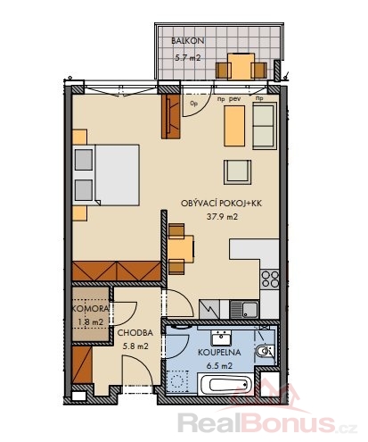 - Úložné prostory: Prostorná komora přímo v bytě, vestavná šatní skříň a botník v předsíni.