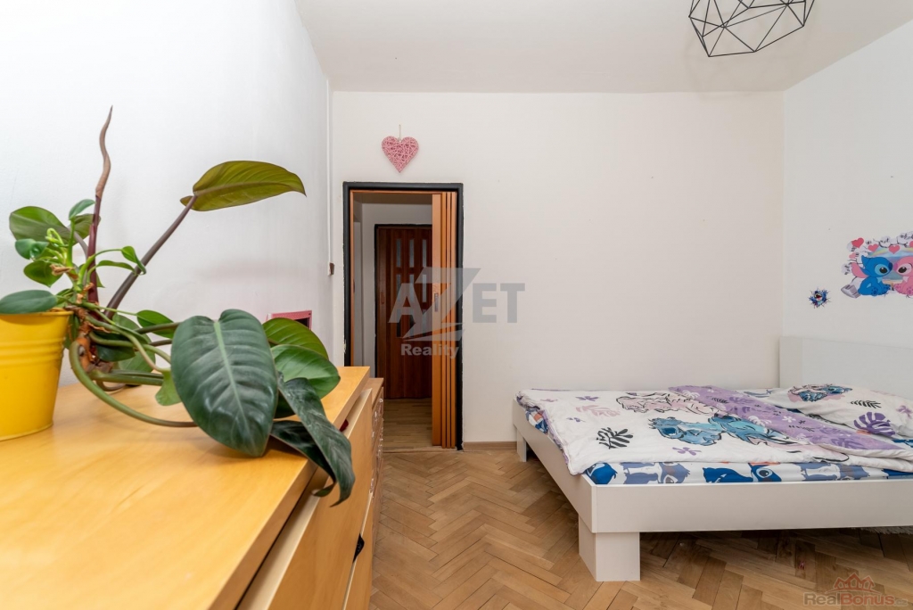 Byt nabízí zajímavý potenciál pro úpravu dispozice například vybudování šatny nebo pracovního koutku v obývacím pokoji.