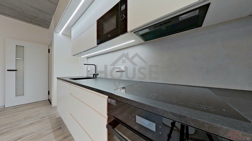 Součástí bytu je kuchyňská linka na míru s kamennou pracovní deskou a vestavěnými spotřebiči AEG, která splní očekávání i náročnějších klientů.