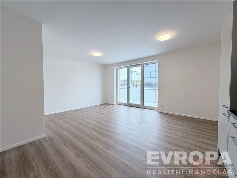 Dominantou bytu je prostorný obývací pokoj se vstupem na terasu o výměře 7 m a kuchyňským koutem, který je vybaven kuchyňskou linkou se spotřebiči (varná deska, trouba, digestoř, lednice, myčka).