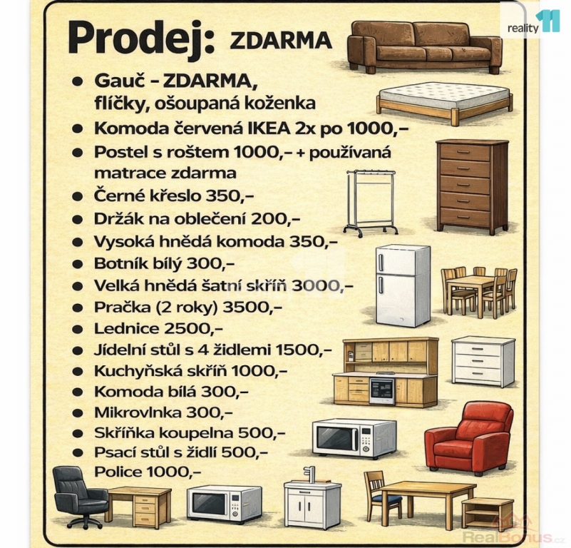 Po dohodě je možné odkoupit nábytek od současných nájemníků. Ceník nábytku je v poslední fotografii.