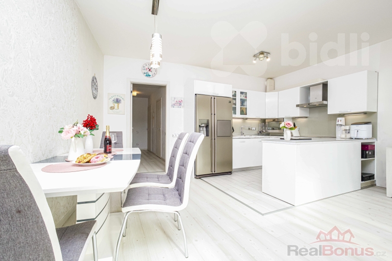 Vyvýšený obývací pokoj s kuchyňským koutem orientovaným na jižní stranu s výměrou 39m2, kde místnost je po celý den krásně prosvětlená, s přímým vstupem na 25m2 terasu, která rozšiřuje obytný prostor o další příjemnou venkovní zónu. Terasa navíc sousedí pouze se stezkou pro pěší.