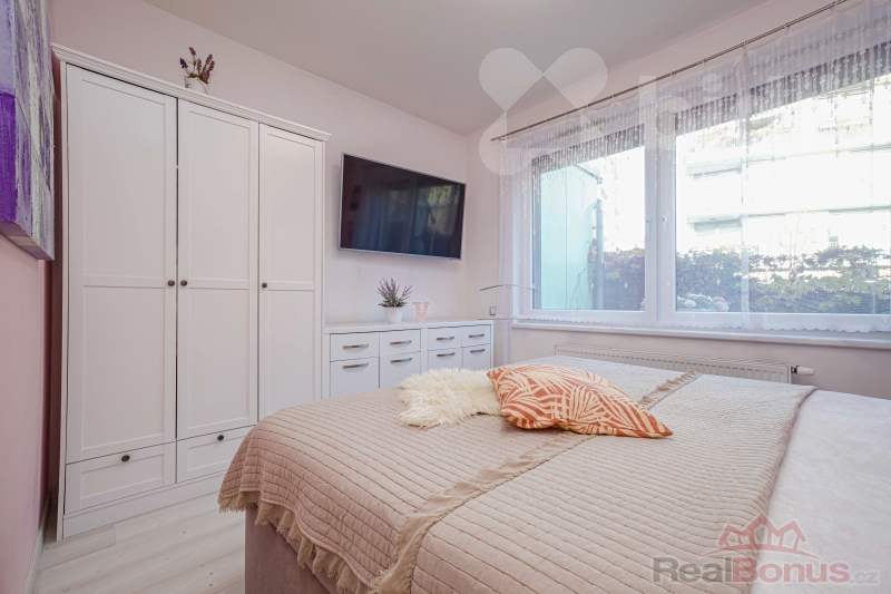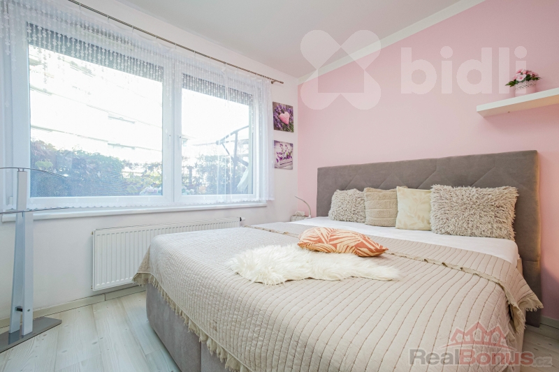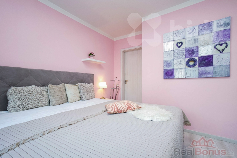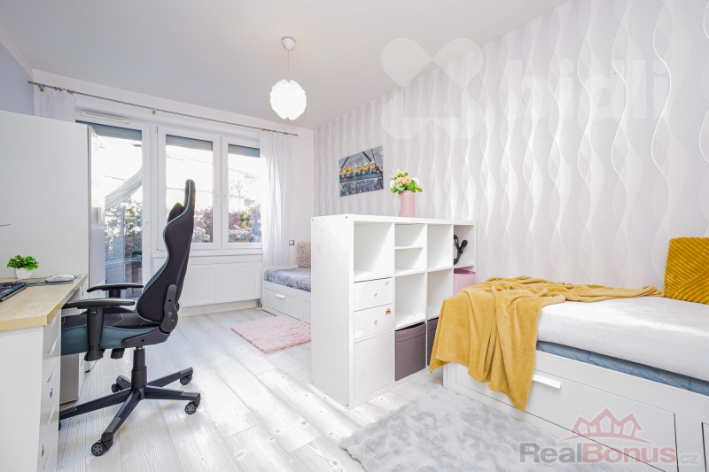 Dvě ložnice (16,1 a 11,3m2) orientované na sever se vstupem z jedné z nich na terasu o velikosti 5 m2 a na 14 m2 předzahrádku směřující do klidného vnitrobloku se zelení, což zajišťuje stabilní teplotu a klidný spánek i během letních měsíců.