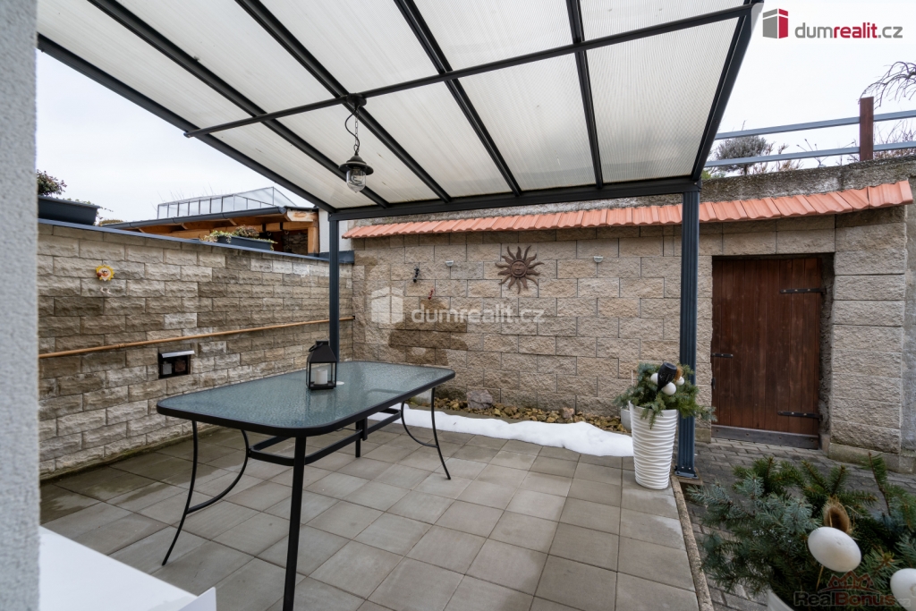 Abyste se dostali na dvorek, kde je příjemné venkovní posezení pod přístřeškem, nemusíte obcházet dům, v kuchyni jsou balkonové dveře, kdy vyjdete s kávou v ruce přímo na tuto terasu.