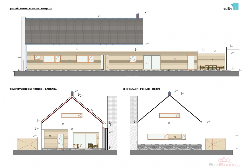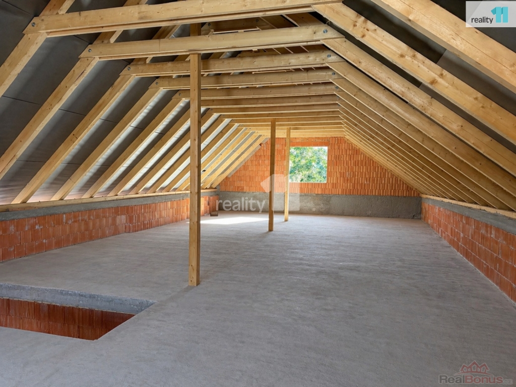 Dispozice domu: Obývací pokoj s kuchyňským koutem (70 m) dominantní prostor domu s možností instalace krbových kamen, přímý vstup na terasu a zahradu, ložnice (15 m) se samostatnou šatnou, další 2 pokoje (každý 14 m) vhodné jako dětské pokoje, pracovna (9 m) ideální pro práci z domova, dvě koupelny (12 m a 8 m) a samostatné WC, technická místnost, spíž, chodba a několik šaten pro maximální komfort a úložný prostor. Dům bude díky promyšlené dispozici vyhovovat i náročnější rodině s dětmi. Technické řešení: Zdivo - Porotherm se zateplením minerální vatou 20 cm, Střecha: sedlový krov, pálená krytina Tondach v barvě antracit, Okna: plastohliníková, trojskla, Vytápění: tepelné čerpadlo vzduchvoda s podlahovým topením + krbová kamna v obývacím pokoji, Ohřev TUV: zásobník napojený na tepelné čerpadlo, Větrání: rekuperační jednotka s účinností minimálně 85 %. Energetická náročnost: projekt splňuje normy pro úsporné domy (ČSN 73 0540). Celková plocha pozemku: 1 023 m.