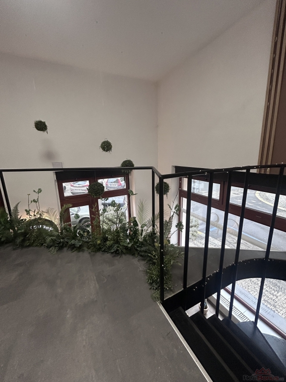 Prostor má dřevěná okna a výklad s elektricky ovládanými venkovními roletami. Na podlahách jsou vinylové krytiny, PVC a keramická dlažba.