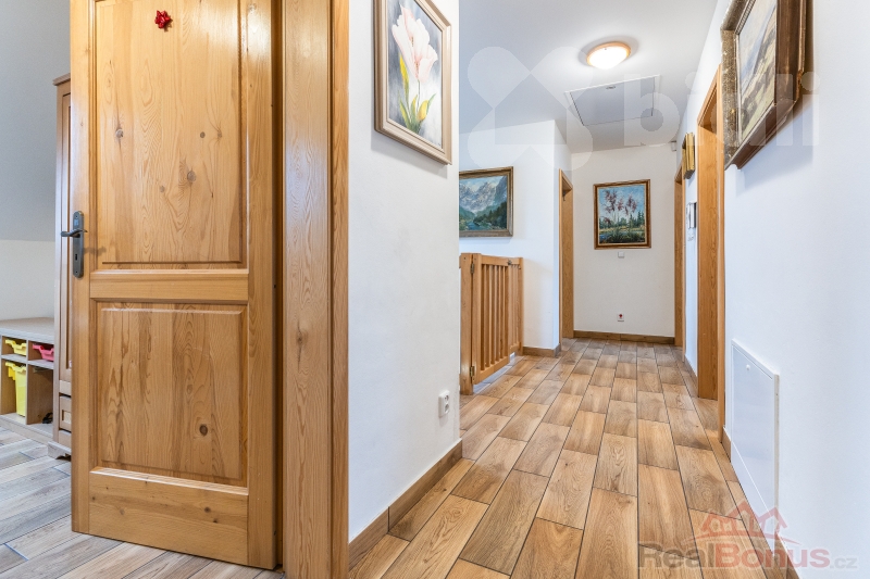 První patro je pak koncipováno jako klidová zóna se čtyřmi samostatnými pokoji a druhou koupelnou a samostatnou toaletou.