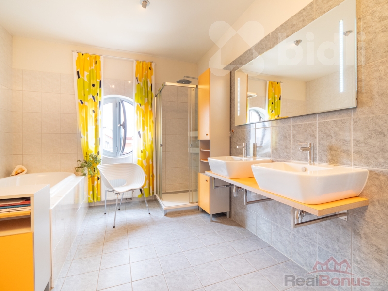 Koupelna s podlahovým vytápěním, samostatné WC a technická místnost s dostatkem úložného prostoru.