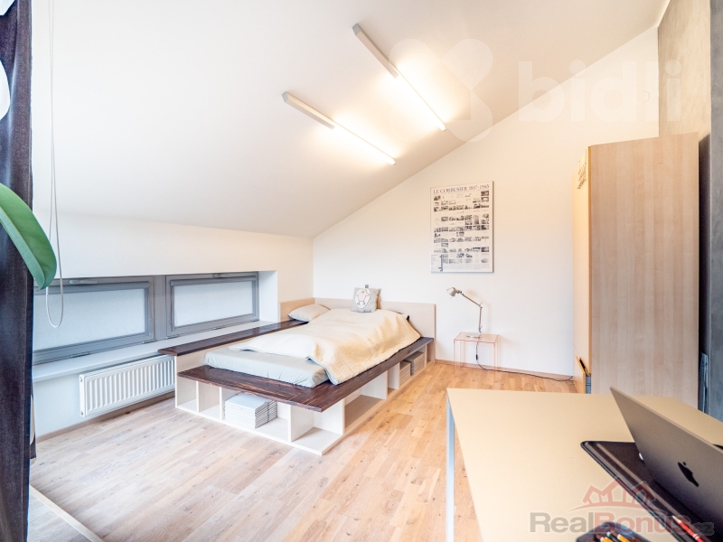 Hlavní ložnice s vlastní šatnou a další dvě prostorné ložnice (pokoj, pracovna) poskytují komfort pro rodinu i hosty.
