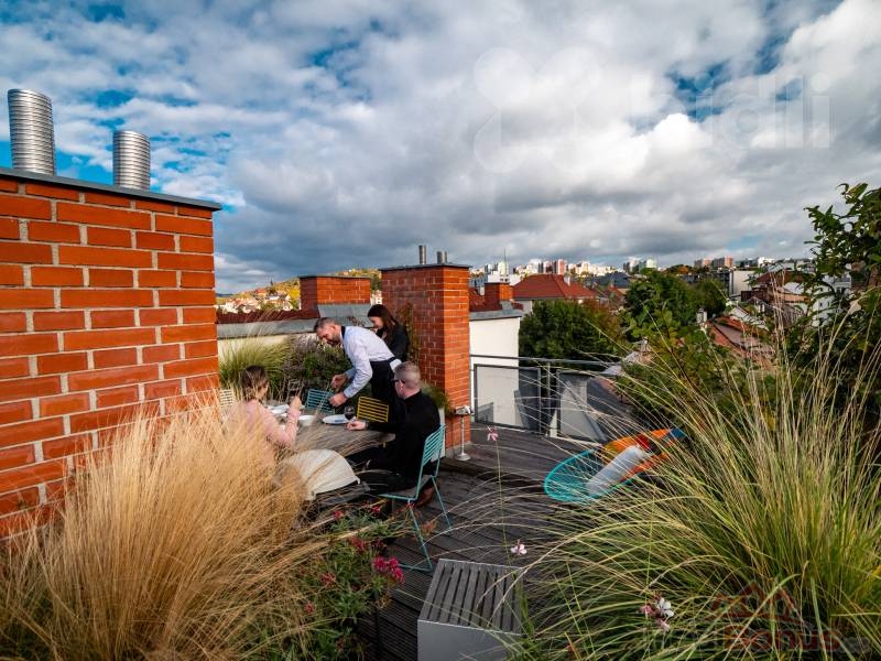 Střešní zahrada (34,7 m2) - prosluněný prostor s výhledem do všech světových stran, ideální pro relaxaci, grilování, či večerní posezení u vína.