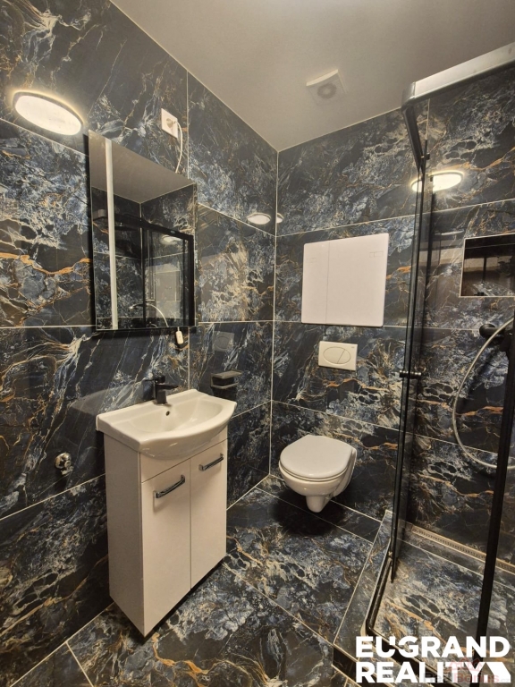 Koupelna je společná s WC. Je vybavená umyvadlem, sprchovým koutem a dostatečným prostorem pro umístění pračky.