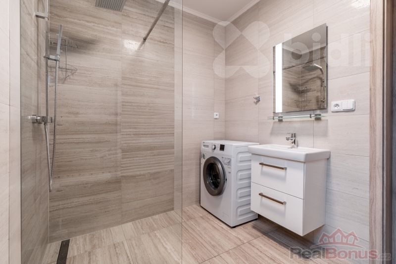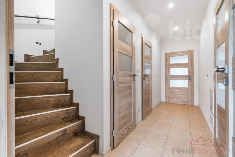 Uvnitř je to promyšlené pro normální život. Dvě koupelny jsou luxus: v přízemí toaleta, topný žebřík, umyvadlo, pračka, sprchový kout - rychle, pohodlně, prakticky. V patře koupelna s vanou a toaletou - večerní relax a pohoda. V přízemí potěší předokenní rolety, které udělají soukromí i příjemný stín v létě. Komfort doplňuje podlahové vytápění - žádné radiátory, jen čistý design a teplo tam, kde má být. O úsporný provoz se stará tepelné čerpadlo, elegantně schované v chodbě, takže nikde nepřekáží a neruší. Okolí domu je pod kamerovým systémem.