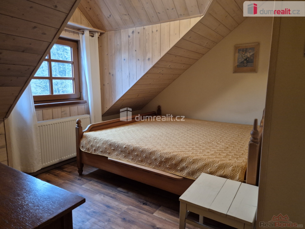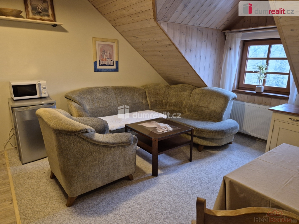 Jedná se o velmi pěkný a kompletně vybavený byt, přístupný po vnějším dřevěném schodišti, který tvoří chodba, dvě ložnice, jednolůžková a dvoulůžková (manželská), obývák s kuchyňským koutem a koupelna se sprchovým koutem, umyvadlem a WC.