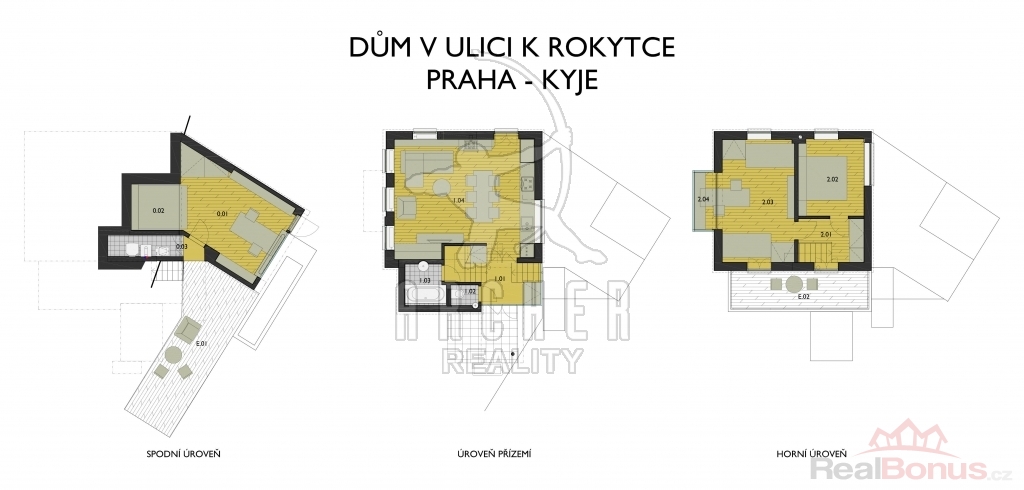 Díky mírnému svahu je dům ve třech úrovních. Hlavní vchod je do obytné části, o patro výš je ložnicová část s balkonem, otevírajícím široký rozhled a o pár schodů níže je další místnost, vhodná jako další ložnice nebo pracovna s obrovským oknem a velkou terasou.