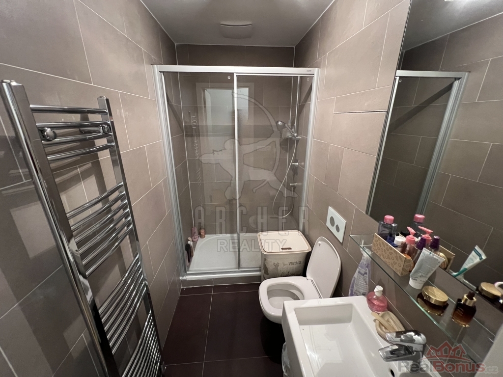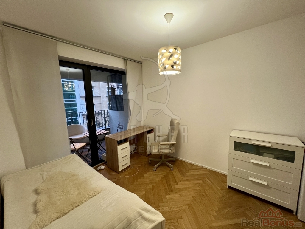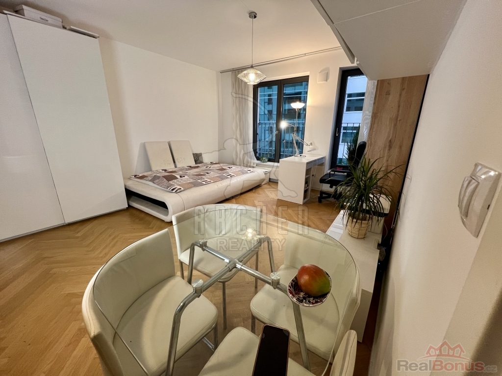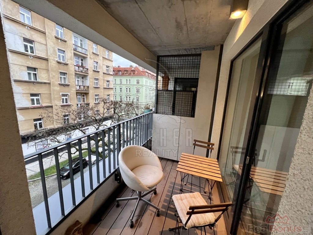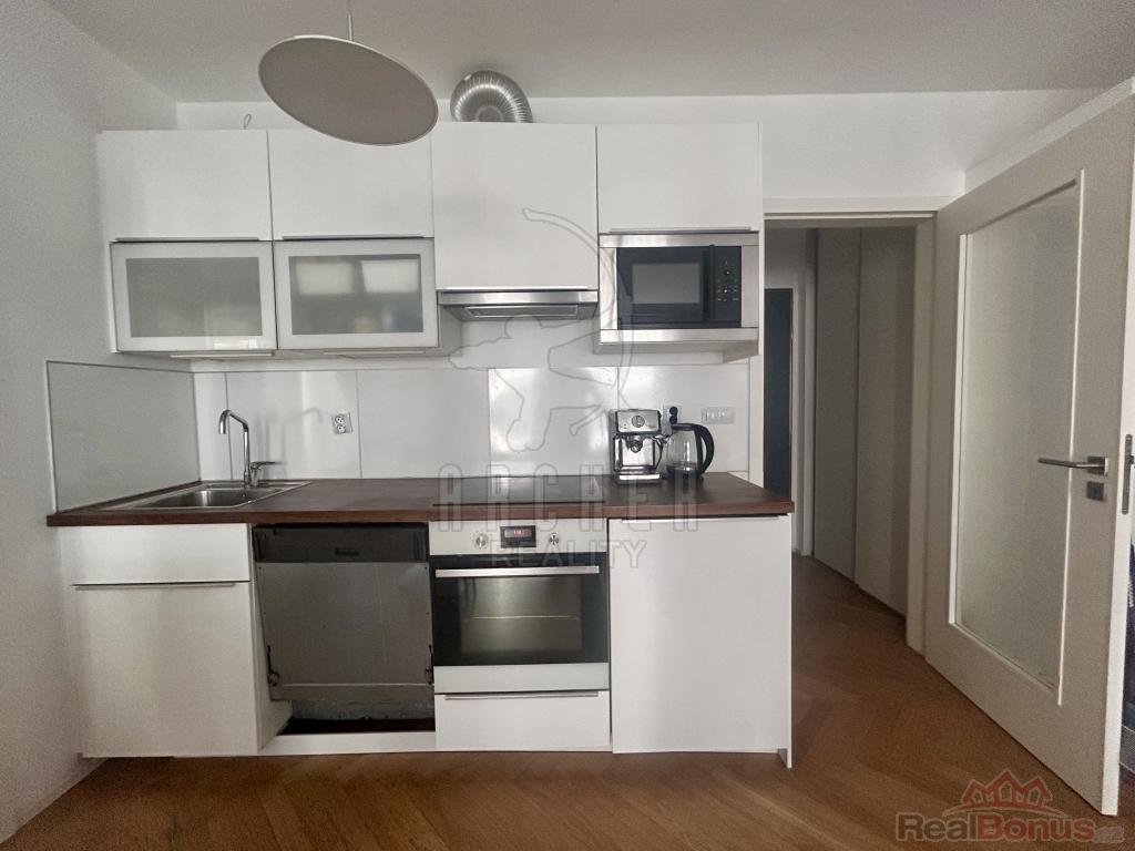 Ze společných prostor vstupujeme skrze bezpečností dveře do praktické chodby, která poskytuje dostatek místa pro úložné prostory. První místnost bytu slouží jako velkorysá obytná kuchyně ústící francouzskými dveřmi se vchodem na balkon. Podélná kuchyňská linka disponuje všemi moderními spotřebiči, designový jídelní set dodává prostoru lehkost a eleganci. Navazující místnost slouží jako ložnice a pracovna zároveň. I zde nalezneme vstup na obytný balkon s příjemným posezením a výhledem na park. V obou místnostech je kvalitní dřevěná podlaha. V samém srdci bytu se nachází ještě koupelna s nadstandardně velikým sprchovým koutem a toaletou. K bytu náleží parkovací stání v suterénu domu, které je součástí prodeje.