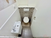 Koupelna je vybavena sprchovým koutem a umyvadlem, toaleta je v samostatné místnosti. Z obývacího pokoje se vstupuje do prostorné šatny s regály a vestavěnou skříní. V zadní části šatny je umístěn plynový kotel na vytápění a ohřev teplé vody. V předsíni je nika na odkládání svršků. Nad koupelnou a toaletou se nachází rozlehlý úložný prostor.