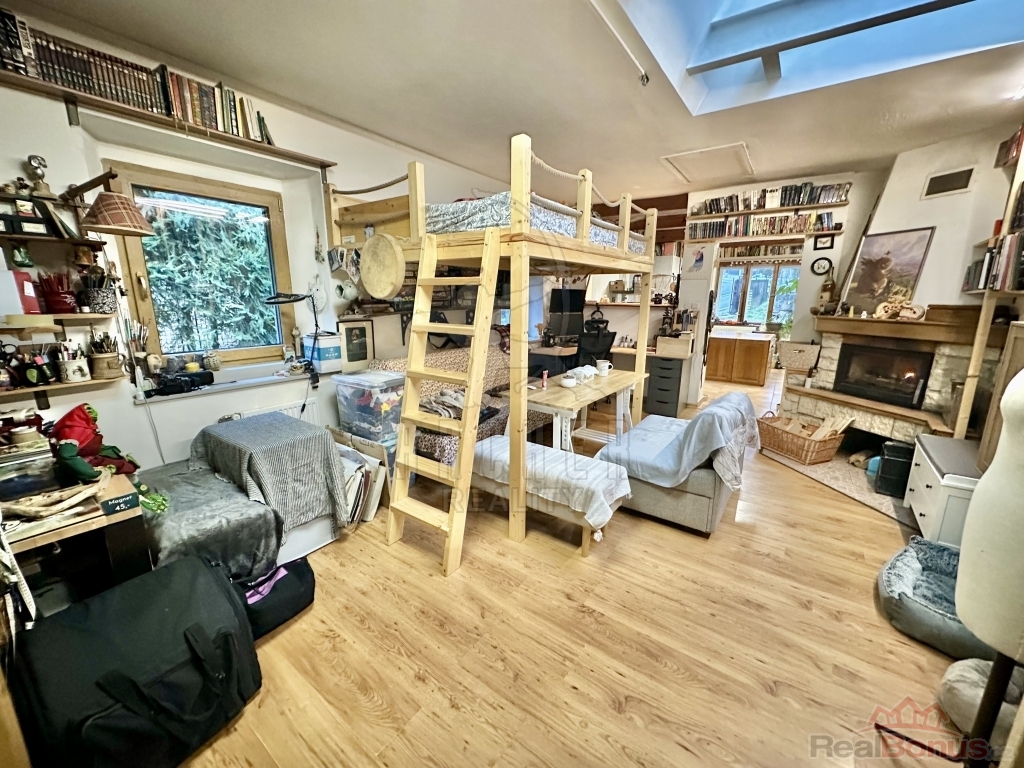 Centrem domu je obývací pokoj s krbovými kamny s výměníkem. Oheň tu není jen dekorací, dává domovu opravdové teplo a atmosféru.
