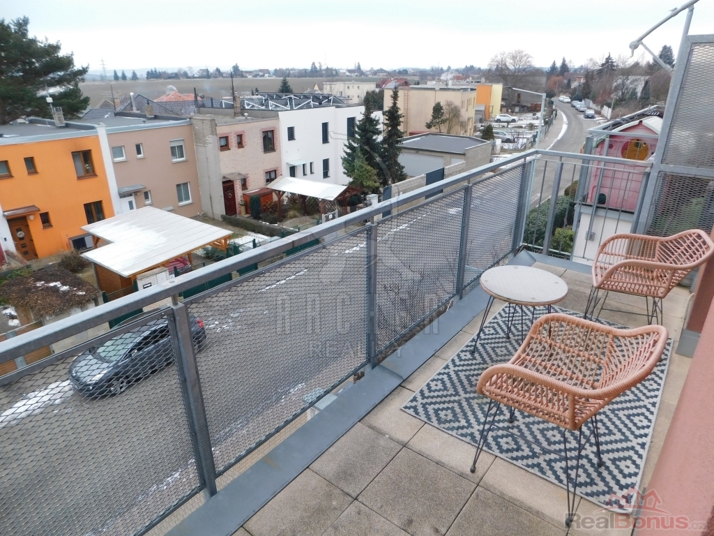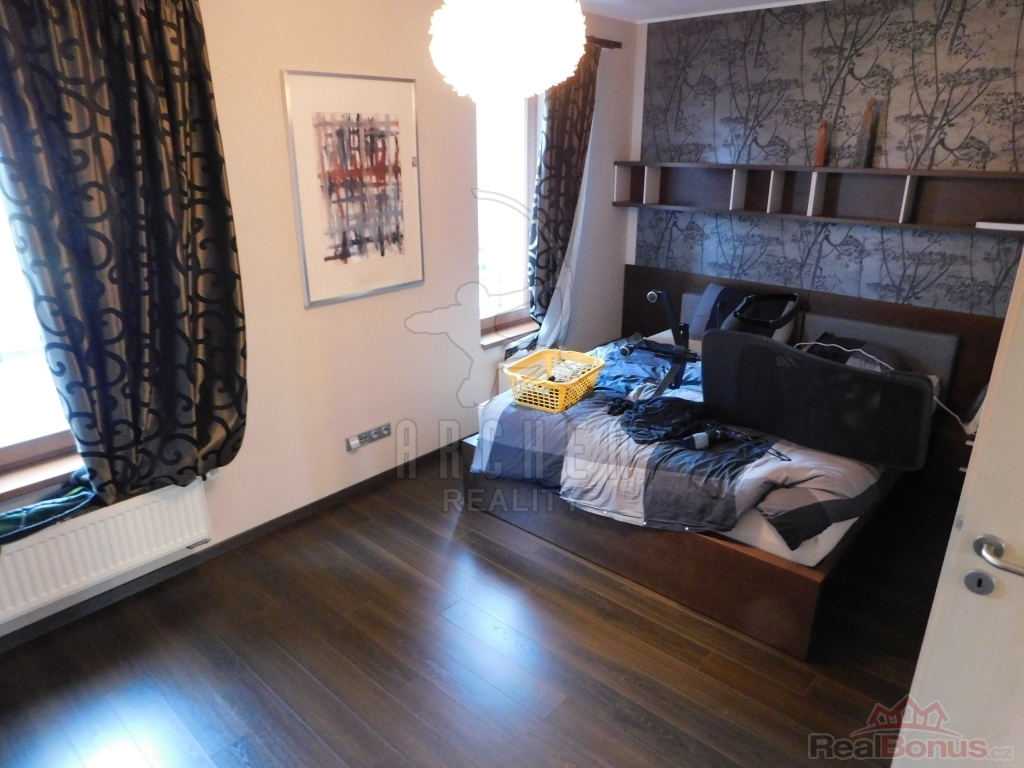 Designová koupelna se sprchovým koutem je zařízená předměty Villeroy & Boch a doplněna baterií a sprchovým setem Hansa. V koupelně je vestavěný stropní zvukový systém Sonos. V koupelně je umístěn plynový kotel, který zajišťuje vytápění a ohřev teplé vody dle individuální potřeby.