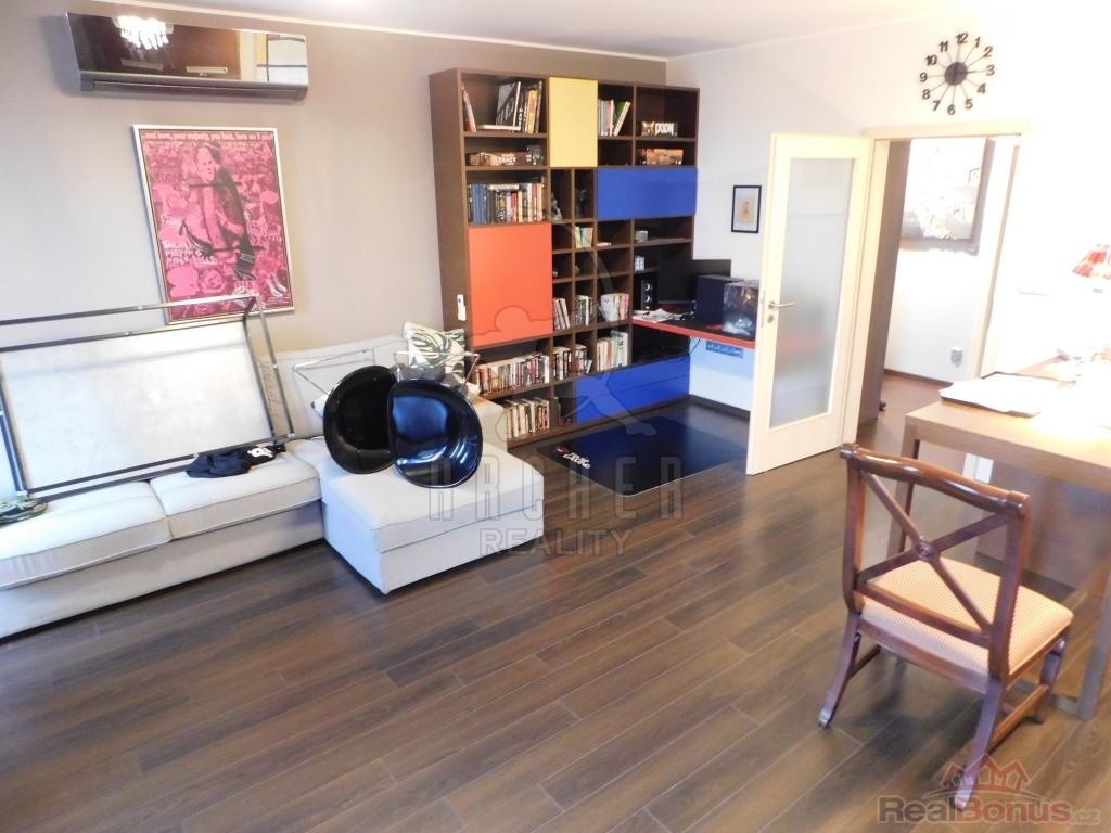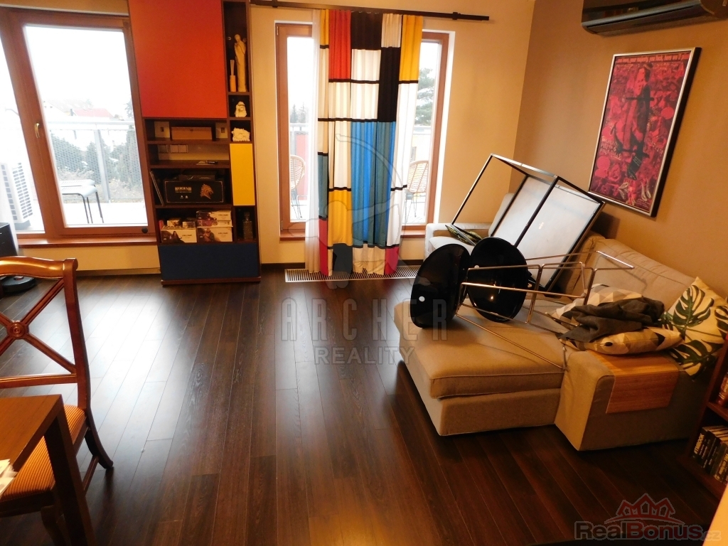 Byt zaujme atypickým, originálním interiérem, inspirovaným dílem Pieta Mondriana a designovým vestavěným nábytkem na míru, který je zahrnutý v ceně bytu.