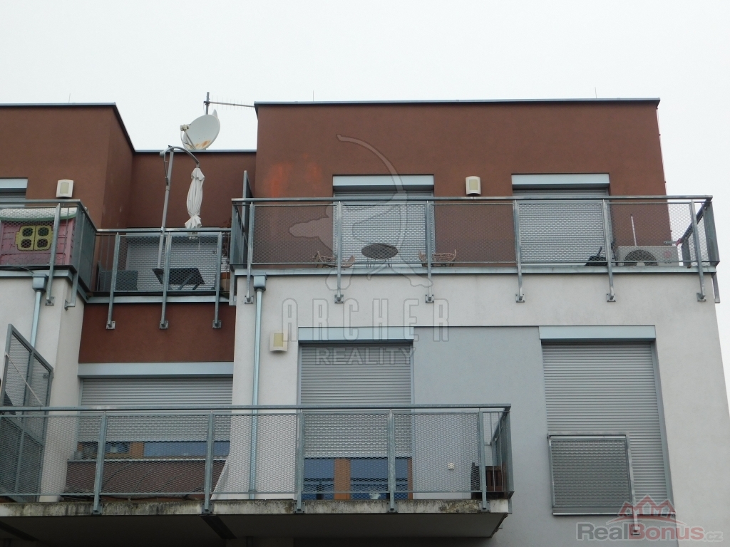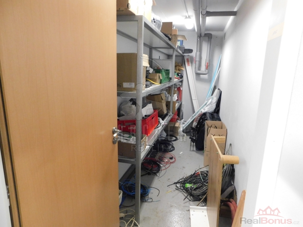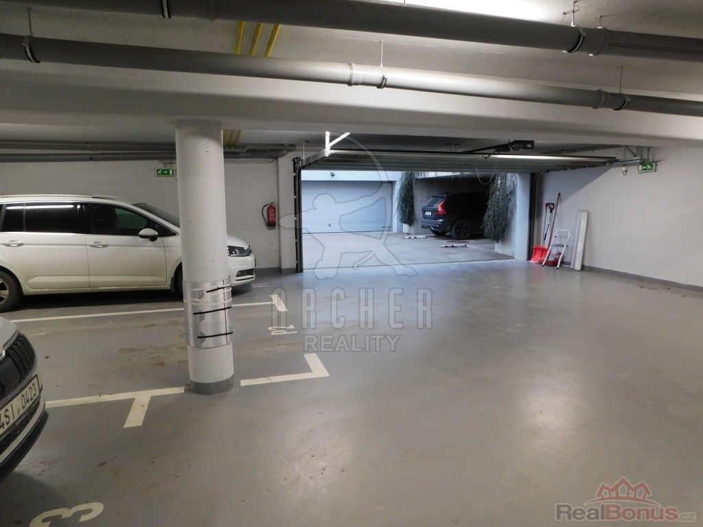 K bytu náleží jedno garážové stání a velký zděný sklep s pevnými regály v prostoru garáží.