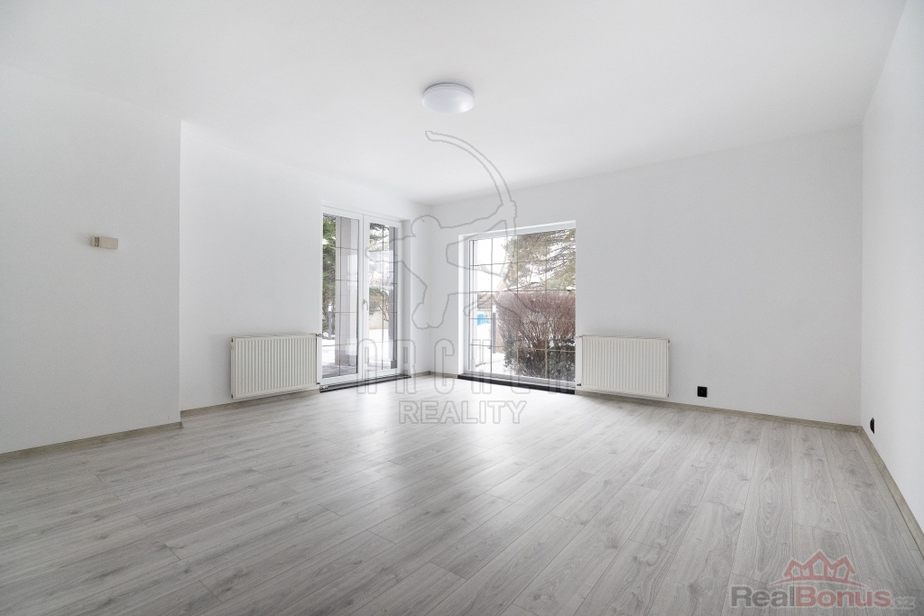 Přízemí nabízí vstupní zádveří, prostornou halu se schodištěm a velkorysý, světlý a klimatizovaný obývací pokoj s velkými okny, dostatkem přirozeného světla a přímým vstupem na udržovanou zahradu s posezením. Součástí je samostatná plně vybavená kuchyň včetně elektrospotřebičů, spíž propojená s garáží, ložnice, pracovna, koupelna se sprchovým koutem a toaletou a technická místnost s elektrokotlem a bojlerem.