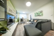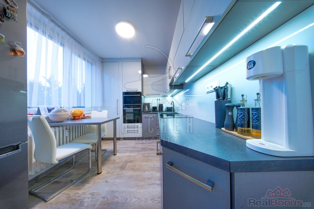 Obývací pokoj s jídelním koutem a kuchyně jsou otočeny k jihovýchodu směrem k ul. Na Radouči. Kuchyně je zařízena na míru a moderně, nechybí ani myčka a indukční varná deska, stejně jako vestavěná trouba a mikrovlnná trouba, linka nabízí dostatek prostoru a potěší chytře promyšlené úložné prostory. I v kuchyni je jídelní kout a vešla se i vysoká lednice. Prostor prosvětluje samostatné okno.