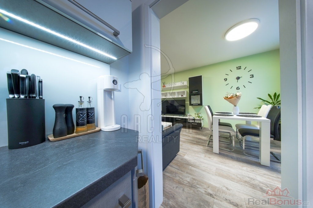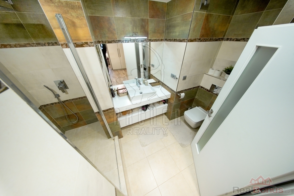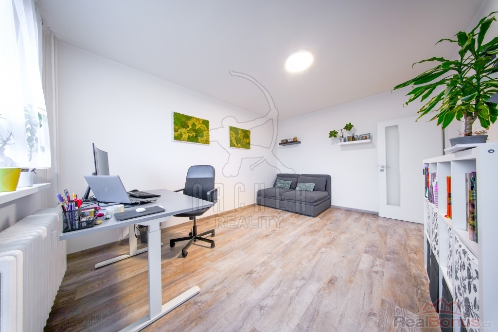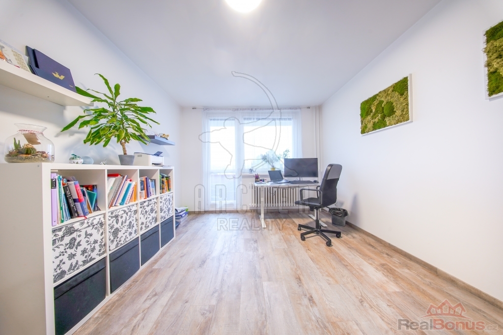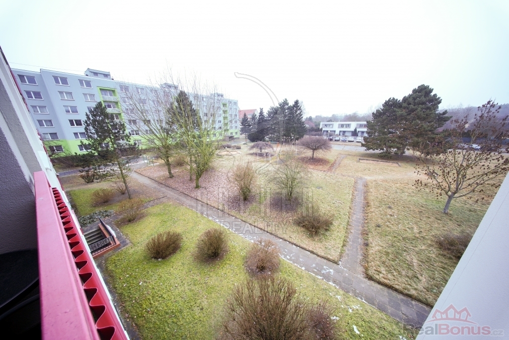 Pokoje jsou otočeny k severovýchodu, směrem k národní přírodní památce Radouč. Větší z pokojů má přístup na 4m2 lodžii s pěkným výhledem do přírody. V předsíni jsou instalovány nové velké vestavné skříně až do stropu. Koupelna s WC a místem na pračku i sušičku má nadstandardně prostorný sprchový kout.