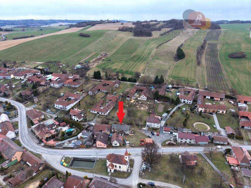 Pozemek má 241 m a leží přímo na návsi, v samotném srdci obce, jen pár kroků od malého kostelíka, který dotváří klidnou atmosféru místa.
