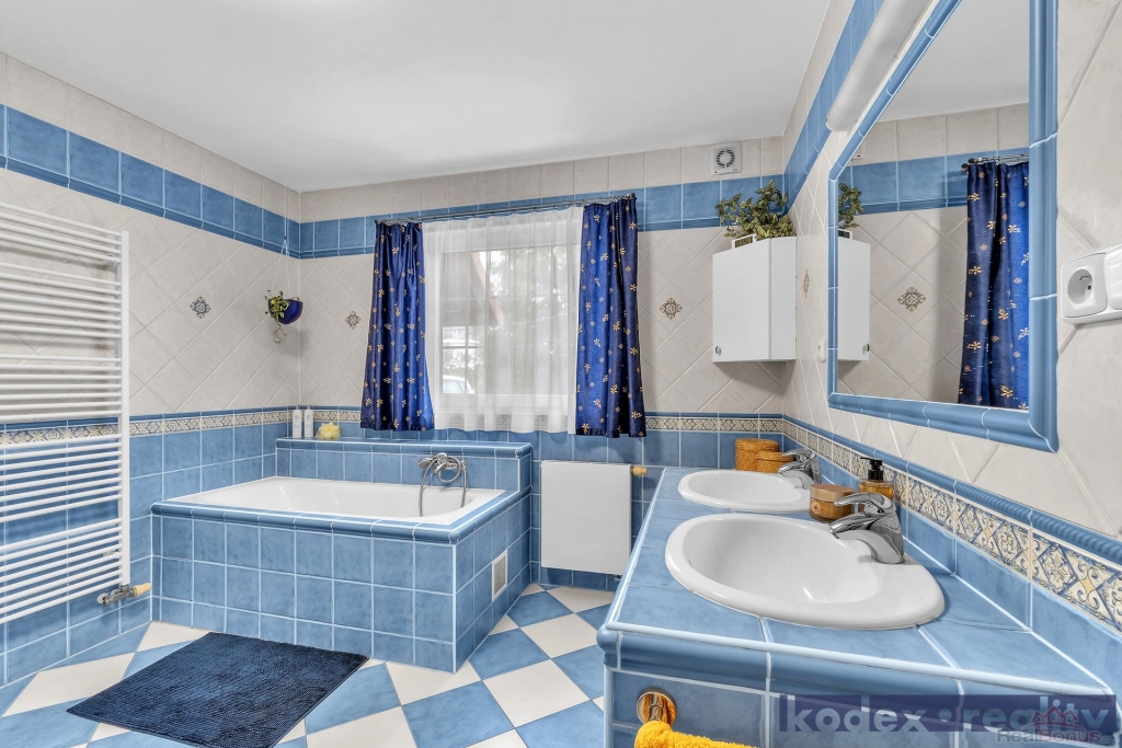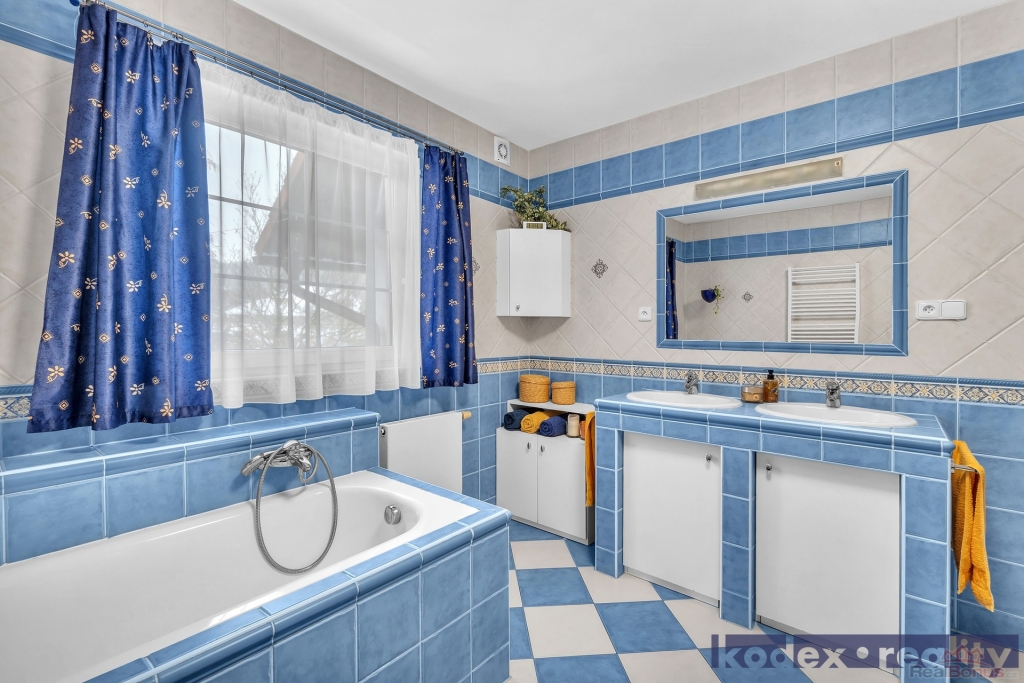 Přízemí - zádveří, WC, hala s botníkem a schodištěm do 1.patra, obývací pokoj s jídelnou a kuchyňským kouterm, ložnice, komora, koupelna s vanou i sprchovým koutem, WC a bidetem, spojovací úložná místnost do garáže pro dva automobily, jejíž součástí je také technická místnost a dílna se vstupem na zahradu.