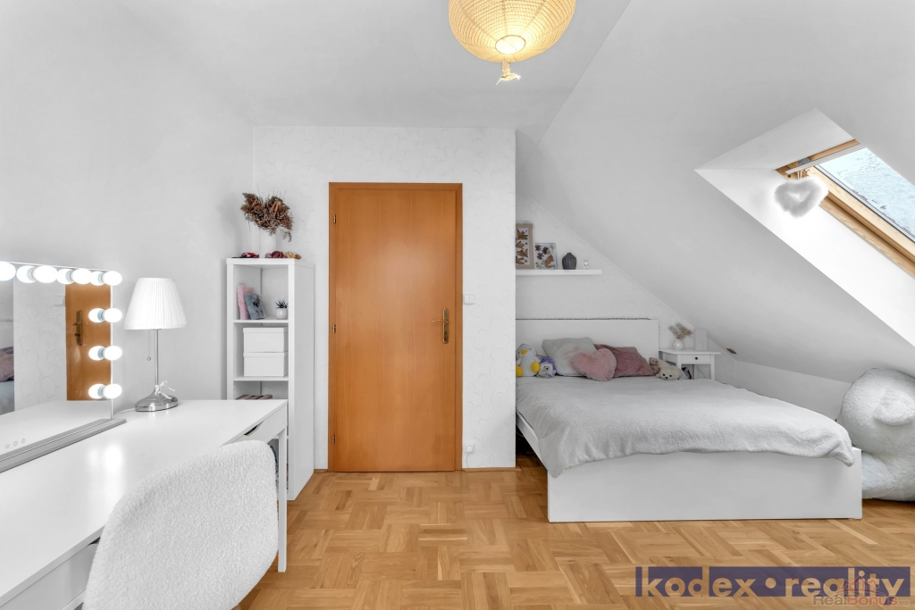 1.NP - chodba se vstupem na úložnou půdu, pokoj pro hosty/pracovna, 2x dětský pokoj, koupelna s WC a velká technická místnost s úložným prostorem, plynovým kotlem a pračkou.