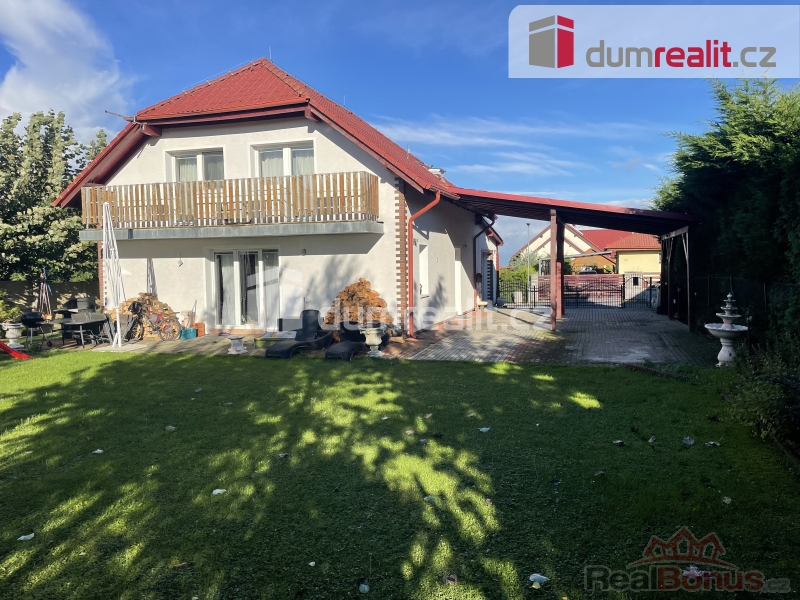 Kolem domu prostorná udržovaná zahrada se zavlažovacím systémem, využívající dešťovou vodu. Součástí prodeje je garáž na dvě osobní vozidla navazující na obytnou část domu s venkovním zastřešeným parkovacím stáním na více osobních vozidel. Celý pozemek oplocen, vstup z obecní komunikace bránou s elektrickým pohonem.