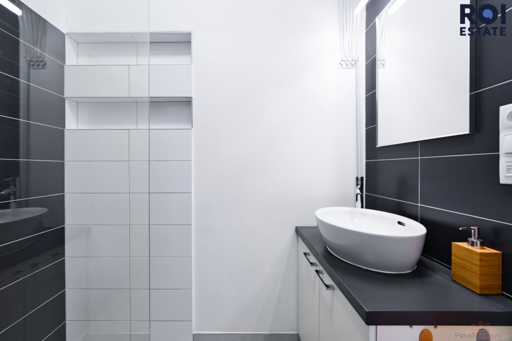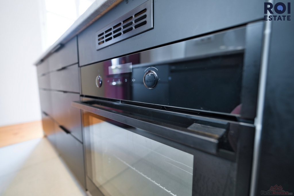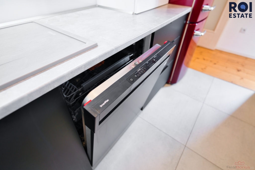 Byt je zařízen moderní kuchyňskou linkou s vestavěnými spotřebiči, včetně lednice, myčky, sporáku a trouby. V koupelně najdete prostorný sprchový kout, samostatnou toaletu a pračku. Velkým bonusem jsou vestavěné skříně, které poskytují dostatek úložného prostoru.