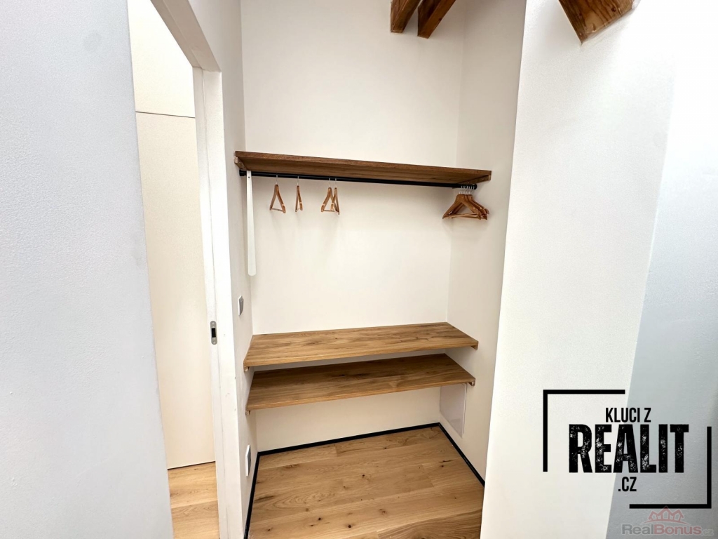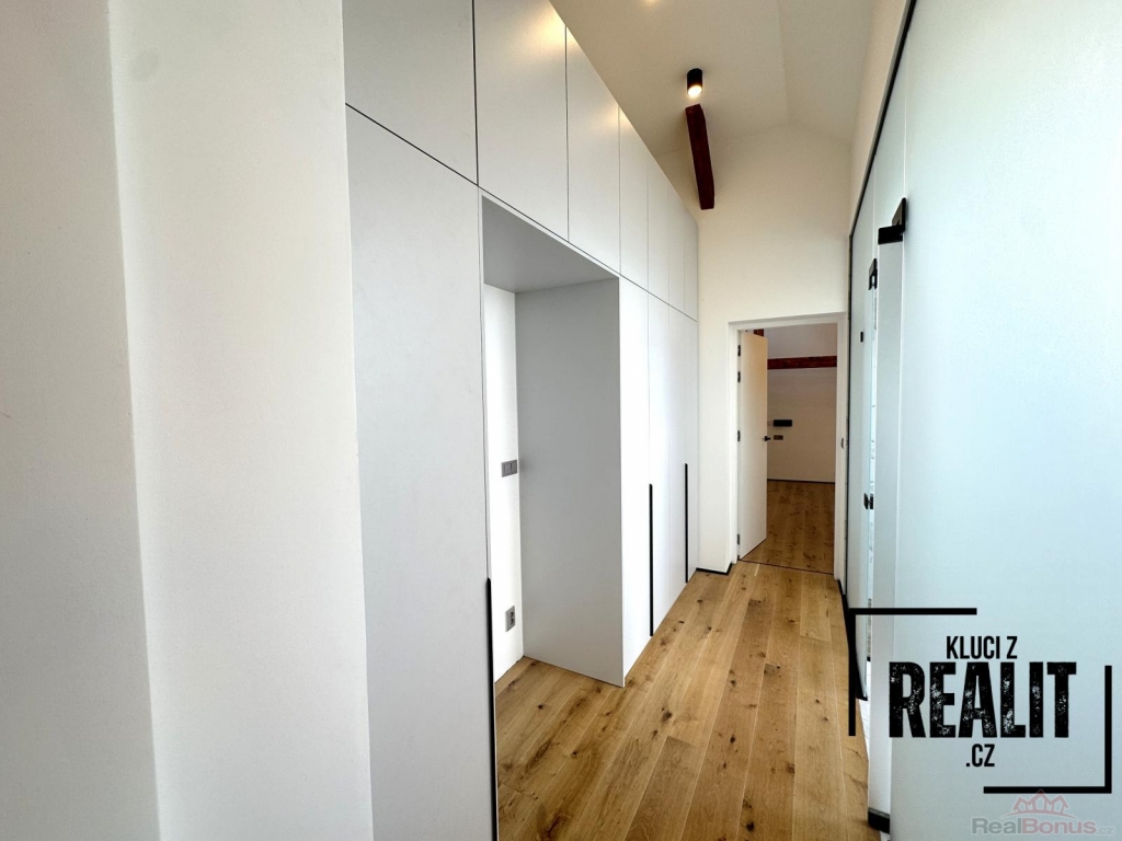 Ze vstupní chodby je přístup do technické místnosti, dětského pokoje, koupelny se sprchovým koutem s infračerveným světlem a bidetovým záchodem pro hosty a obývacího pokoje s prostornou a vybavenou kuchyňskou linkou a přístupem na terasu, která směřuje do klidného vnitrobloku s výhledem na vrch Petřín. Kuchyň je vybavena myčkou, troubou, indukčním vařičem, lednicí, mrazákem, mikrovlnou troubou, vinotékou a ohřívačem talířů.