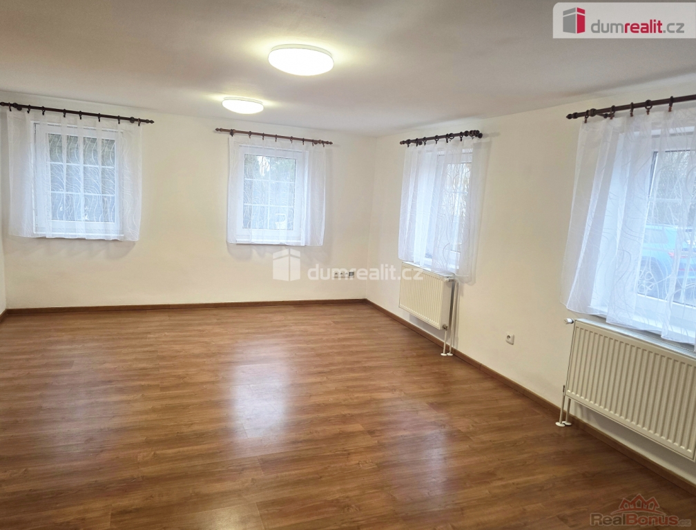 , pronájem rodinného domu 4+1 v obci Horní Bousov. Dispozice domu v přízemí: průchozí komunikační chodba se schodištěm do podkroví a ven na zadní terasu. Z chodby se pak dostaneme do koupelny (se sprchovým koutem, umyvadlem a WC), dětský pokoj, ložnice, jídelna která je opticky propojená s kuchyní. Kuchyňská linka má vestavěnou troubou, varnou deskou a digestoř. V jídelně jsou instalována nová krbová kamna s rozvodem do radiátoru a jako druhá varianta je v domě nainstalovaný elektrický kotel.