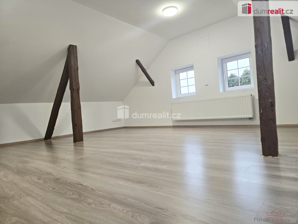 V patře je jedna velká místnost vhodná jako velký obývací pokoj nebo ložnice. Po celém domě jsou nové plovoucí podlahy,keramická dlažba, nová plastová okna se žaluziemi. Za domem je zahrada s menší terasou.