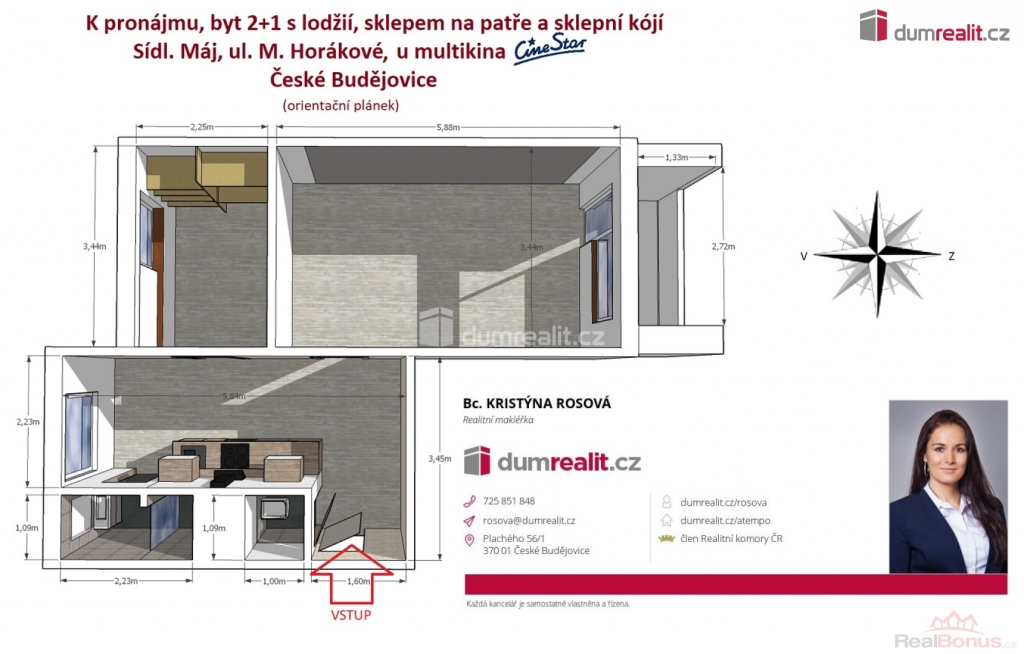 + poplatky 2.500,- Kč/měsíc/2 osoby + el. energie, která se převádí na nájemce., Dumrealit.cz Vám zprostředkuje pronájem světlé, stylově zrekonstruované bytové jednotky o dispozici 2+1 s lodžií, sklepem na patře a sklepní kójí na sídlišti Máj u multikina Cinestar, ul. M. Horákové ve městě České Budějovice. Podrobné rozkreslení dispozice naleznete na orientačním plánku mezi fotografiemi. Orientace bytu je na východní a západní světovou stranu. Byt s lodžií se nachází v 5. patře zatepleného panelového domu s výtahem. Nájemné činí 13.000,- Kč + zálohy na energie ve výši 2.500,- Kč + elektrická energie, která se převádí na nájemce pro 2 osoby měsíčně. Hledáme solidní a dlouhodobé nájemníky. Doporučuji prohlídku, byt bude připraven k nastěhování 1.3.2026. V okolí je veškerá občanská vybavenost. Více informací Vám poskytne realitní makléřka Bc. Kristýna Rosová z realitní kanceláře A TEMPO fungující pod ochrannou známkou dumrealit.cz. Ev. číslo: 654629. Energetický štítek: G