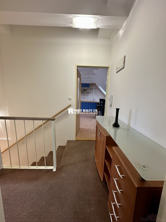 Zprostředkujeme vám prodej družstevního bytu o dispozici 2 + kuchyňský kout, který se nachází ve 4. NP bytového domu umístěného v historickém centru města Beroun. Výměra bytu činí 57 m2. Podkrovní byt se skládá ze vstupního schodiště, obývacího pokoje s kuchyňským koutem, menší ložnice ve tvaru písmene L a prostorné koupelny s vanou a toaletou. Kuchyňský kout je vybaven kuch. linkou. V ložnici je umístěna vestavná skříň. Bytový dům je ve velmi dobrém technickém stavu (nový plynový kotel ve vlastní kotelně). Jedná se o družstevní vlastnictví (anuita splacena). V domě je k dispozici společná kolárna, prostor pro uložení odpadu. Velkou předností domu je udržovaná společná zahrada ve vnitrobloku, kde je možnost užívání bazénu, altánu či grilu. Dům se nachází v centru města a veškerá občanská vybavenost je v dochozí vzdálenosti. Nájezd na D5 je vzdálen 1 km.