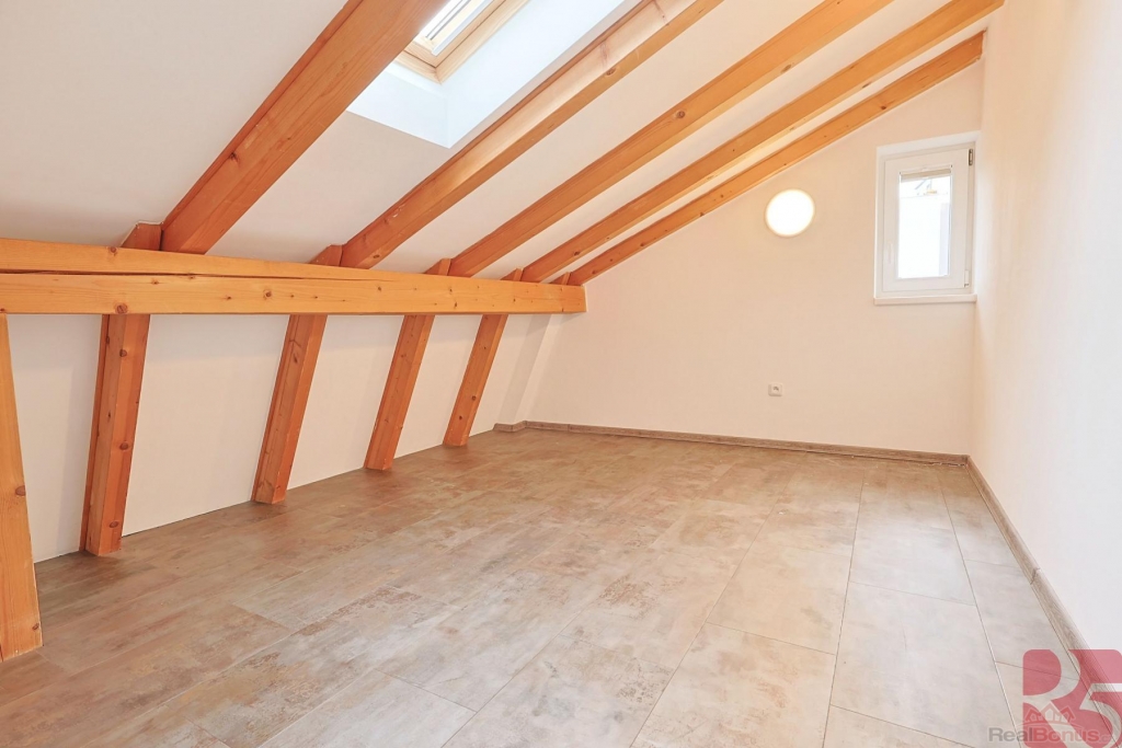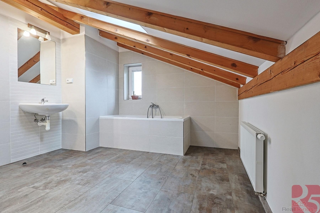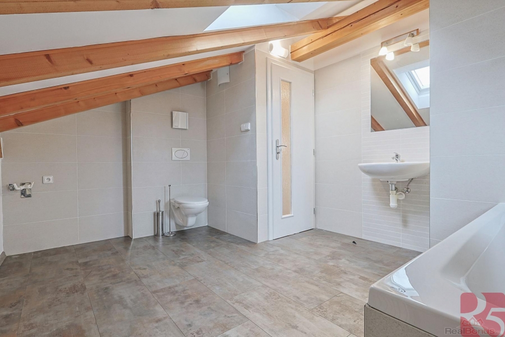 Zde dvě podkrovní místnosti s klimatizací a velká koupelna s vanou a toaletou.