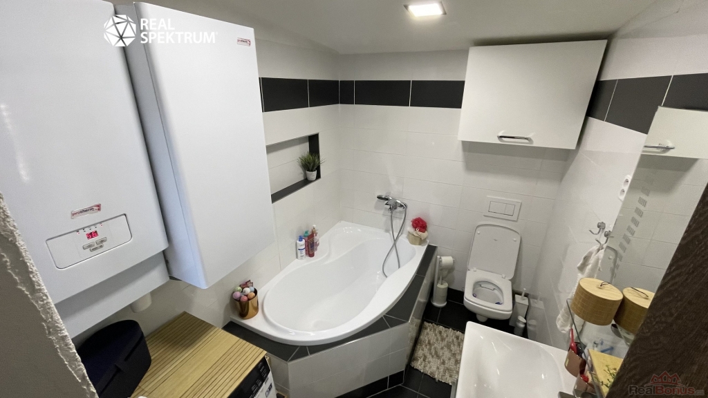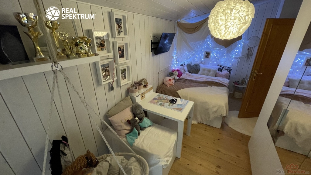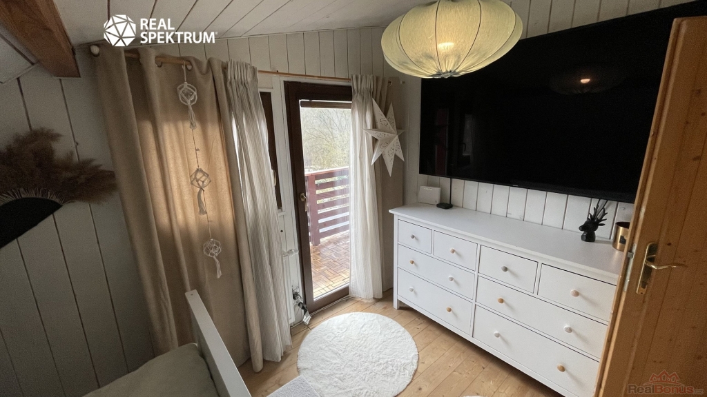 V přízemí domu se nachází moderní koupelna s vanou a prostorný, otevřený koncept kuchyně s obývacím pokojem. Celý prostor je velmi světlý, vzdušný a působí útulným dojmem. V patře jsou situovány dva samostatné pokoje a balkon, ze kterého si můžete vychutnat krásné výhledy do krajiny.