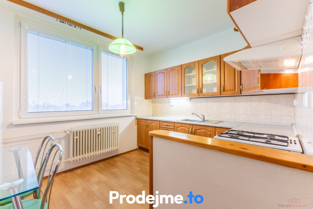 toaletou. V bytě se nachází kuchyňská linka s plynovým sporákem, lednicí, jídelním koutem a