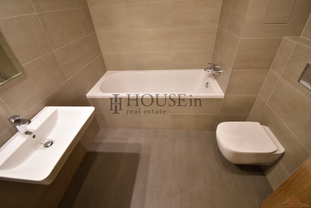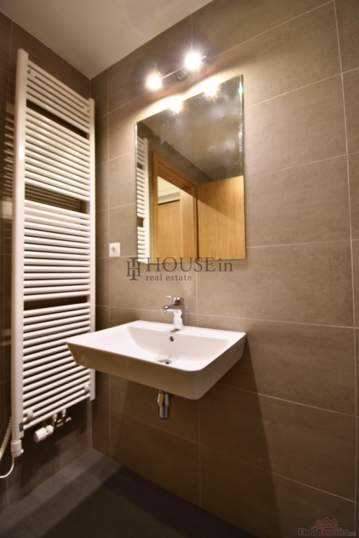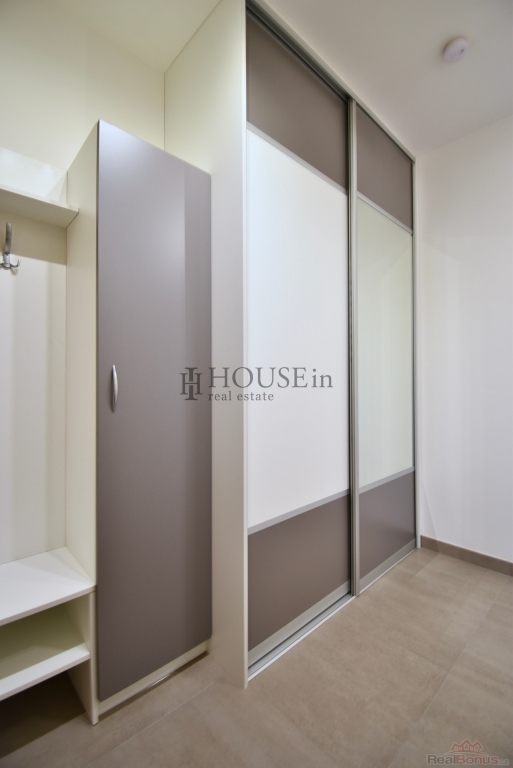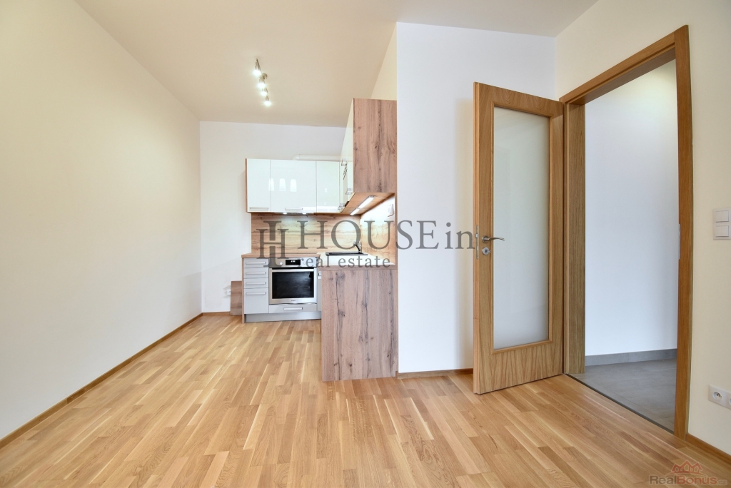 Vstupní předsíň s šatní stěnou a vestavnou skříní, koupelna s vanou, toaletou, umyvadlem a topným žebříkem, obývací pokoj s kuchyňským koutem a moderní kuchyňskou linkou vybavenou vestavnými spotřebiči (indukční varná deska, trouba, mikrovlnná trouba, myčka nádobí, digestoř).