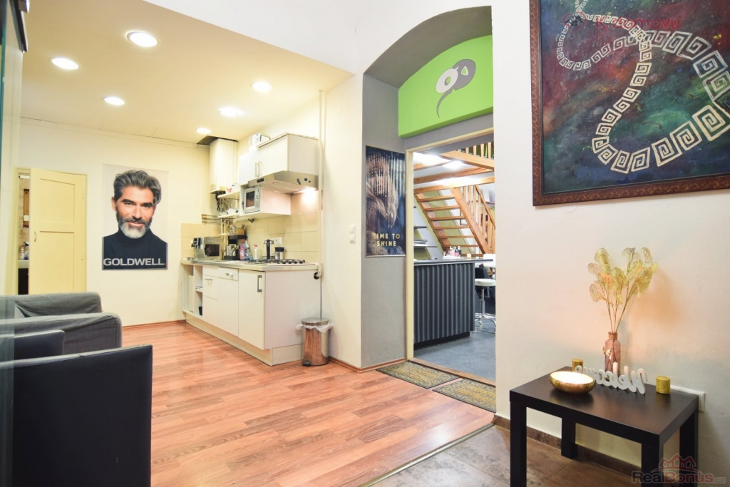 Prodej bytové jednotky 2+1 o přibližné podlahové ploše 66 m2 v prvním nadzemním podlaží historického cihlového domu. Díky výšce stropu 3,6 m2 jsou v obou pokojích zbudované dřevěné podesty o výměrách 5,5 m2 a 7,5 m2 a tak k základní podlahové výměře využitím podest například na spaní získává byt dalších 13 m2. K bytu rovněž patří komora 2 m2, která je umístěna na chodbě domu hned naproti vstupním dveřím do bytu. Byt je aktuálně využíván jako kadeřnictví a lze jej takto užívat i nadále. Byt je samozřejmě vhodný díky své dispozici a umístění v centru města jako investiční, například pro ubytování studentů nebo pracujících.