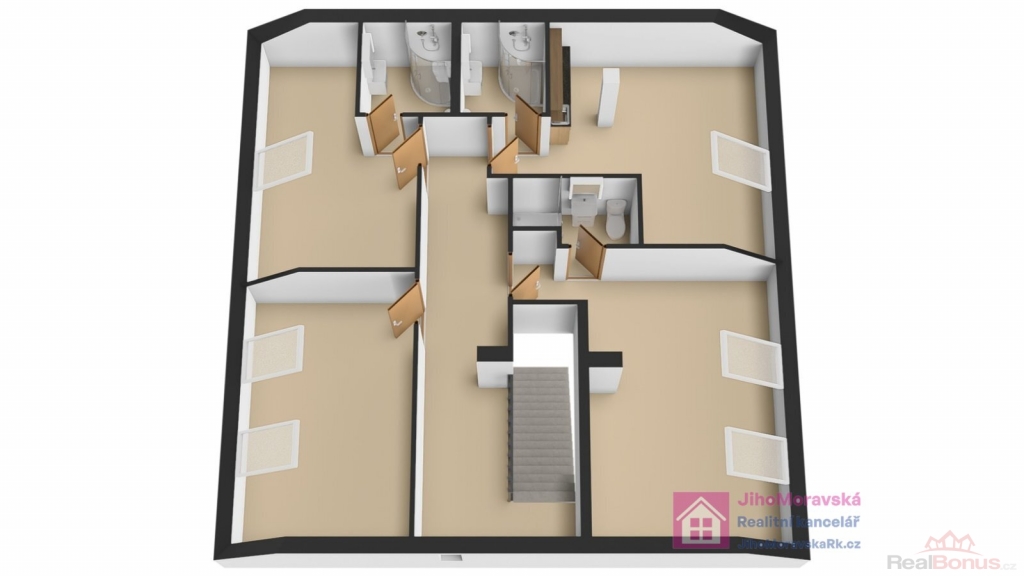 2. nadzemní podlaží: schodiště, chodba, samostatný pokoj a tři neprůchozí pokoje s koupelnou (sprchový kout) a WC. Půdorys celého domu naleznete ve fotogalerii.