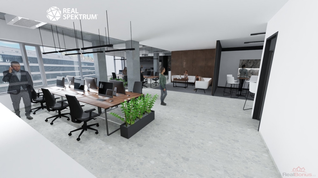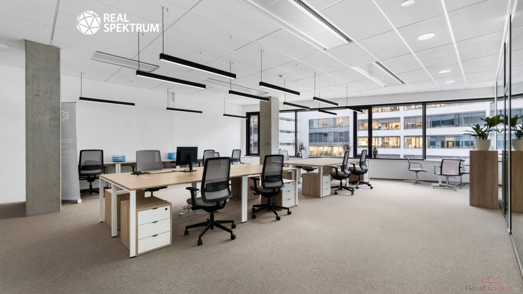 Zdvojená podlaha, veškeré komunikační kabely rozvedeny k jednotlivým pracovním místům, žaluzie, klimatizace, zátěžové koberce, otvíratelná okna, vysokorychlostní připojení k internetu.