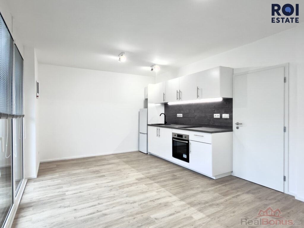 Byt nabízí vstupní předsíň s prostorem pro šatní řešení, moderní koupelnu se sprchovým koutem a hlavní obytný prostor s kuchyňskou linkou vybavenou elektrickou varnou deskou, troubou, lednicí a pračkou.