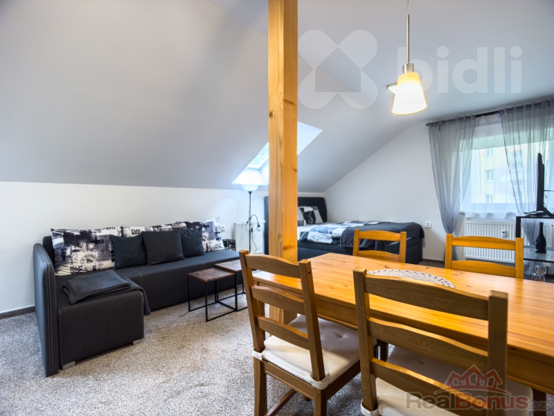 Dovoluje si Vám nabídnout podkrovní apartmán 1+kk v 1NP. Na katastru vedeno jako stavba občanského vybavení. Budova je celá nově zrekonstruována. Apartmán je plně vybavený a připravený k okamžitému rekreování nebo nastěhování. V prostorném hlavním pokoji je obytná část, kde se vejde dvojpostel, rohová sedací souprava, konferenční stůl a televizní stolek, kuchyňský kout s lednicí a s jídelnou, kde je i jídelní stůl pro čtyři osoby. Na chodbě je skříň s trezorem a z chodby je vstup na samostatnou toaletu a vstup do koupelny se sprchovým koutem. Topení a ohřev vody zajišťuje pro každé patro plynový kotel. Ve sklepě je prostorná zděná sklepní kóje kde je možný i přístup zadním vchodem (lze zde mít kolo, kočárek... ). K apartmánu patří k užívání parkovací místo a posezení pro pod venkovní zastřešenou pergolou , kde je moznost i grilování. Jeseník je lázeňské město v srdci Jeseníků, kde je mnoho možností k rekreaci i aktivnímu sportu po celý rok. Kromě možnosti turistiky v atraktivním prostředí Jeseníků a blízkých Rychlebských hor jsou poblíž lyžařské areály Ramzová a Červenohorské sedlo. V okolí se také nachází lázeňské městečko Lipová, Branná s krásným okolím, Javorník se zámkem, Zlaté hory. V samotném Jeseníku se nachází krásné venkovní koupaliště. Skvělá investiční příležitost i na krátkodobý pronájem.