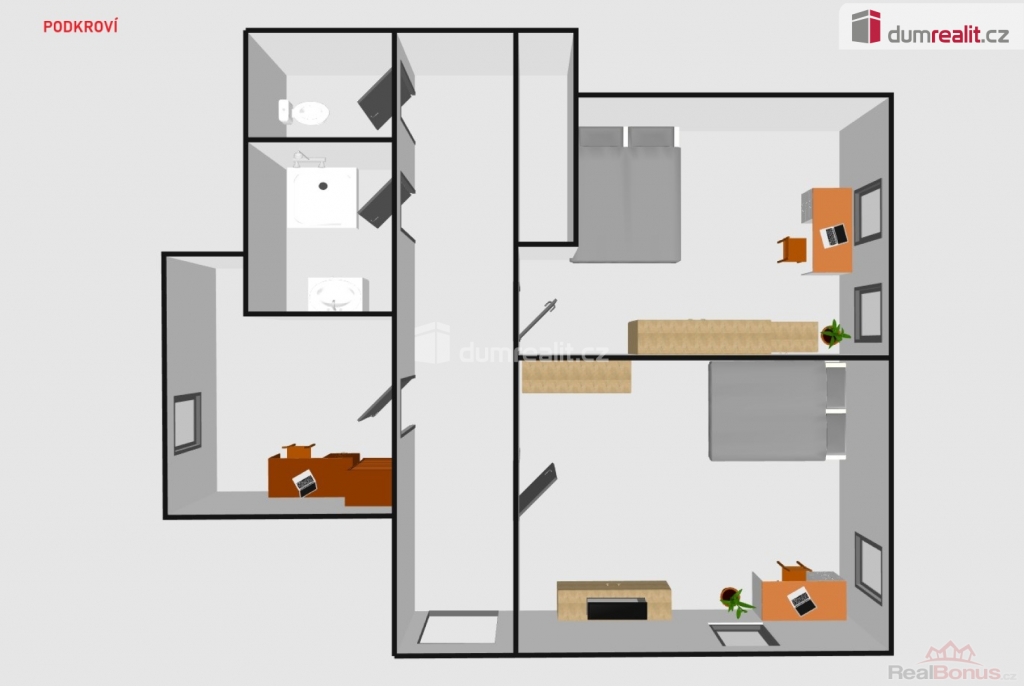 Dispozičně je byt řešen následovně: zádveří, samostatné WC, koupelna, kuchyně 16,5m, obývací pokoj 17m, ložnice 15m, dále se schodištěm z kuchyně přijde do podkroví, které disponuje centrální chodbičkou s klimatizací, pokojem 15m, pokojem 16m, šatnou či technickou místností 8m, koupelnou se sprchovým koutem a samostatným WC.