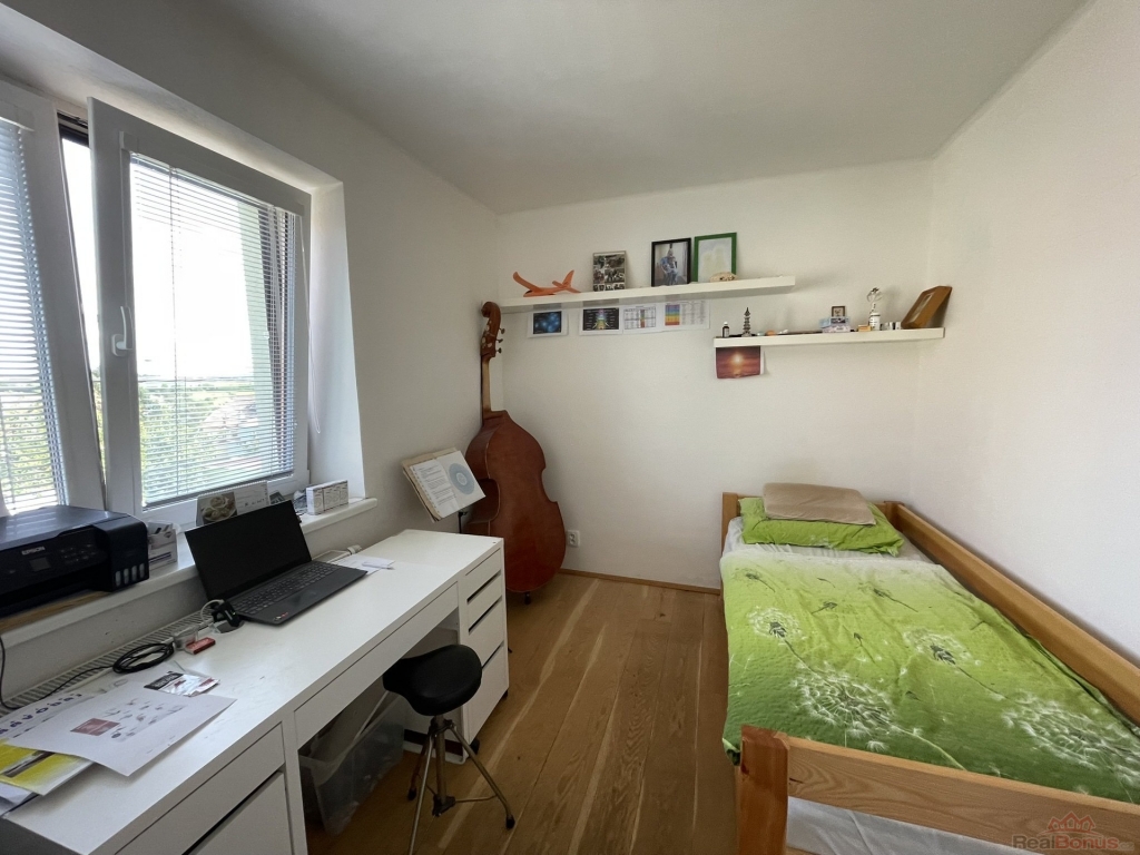 2.NP - menší kuchyňka, 2 velké pokoje, balkon, rodinná koupelna s vanou a WC, úložné prostory, vstup na půdu.