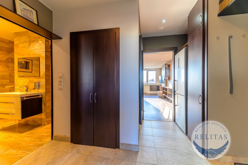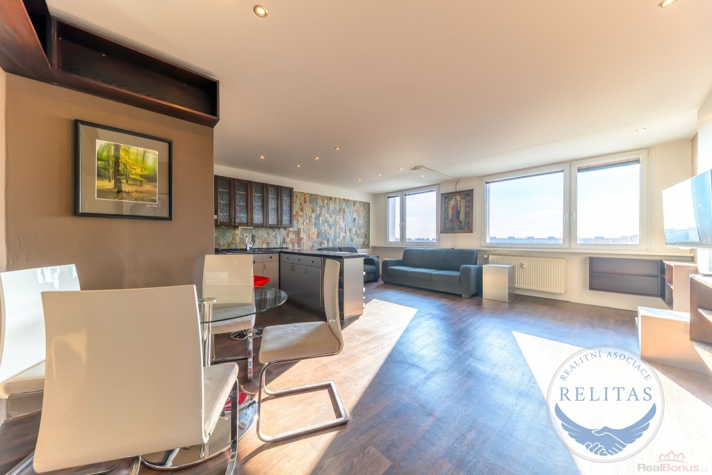 Byt v minulosti prošel kompletní rekonstrukcí, díky které nabízí praktické dispoziční řešení a vkusný interiér. Celková užitná plocha činí 82 m, z čehož podlahová plocha bytu zaujímá 74 m. K jednotce náleží také velkorysá lodžie o rozloze 8 m, která je přístupná z obou ložnic. Díky umístění v desátém patře nabízí lodžie naprosté soukromí a možnost pozorovat krásné východy slunce.